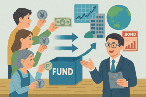- そのお金をひとつの大きな資金にまとめ、専門家(ファンドマネージャー)が株・債券・不動産・海外資産などに分散して運用する
